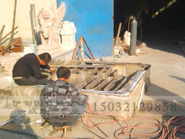 第二步:上大泥覆蓋雕塑造型。上泥完畢一邊用木槌砸實(shí)一邊補(bǔ)平泥間空隙。全部上泥后對(duì)大造型進(jìn)行不斷的調(diào)整。造型不斷需要返工對(duì)骨架進(jìn)行休整直到滿意,以上必須由專業(yè)雕塑師來完成。從此階段開始雕塑必須經(jīng)常噴水保持不開裂,半途公休要覆蓋塑料薄膜進(jìn)行保濕直到雕塑模完成后。